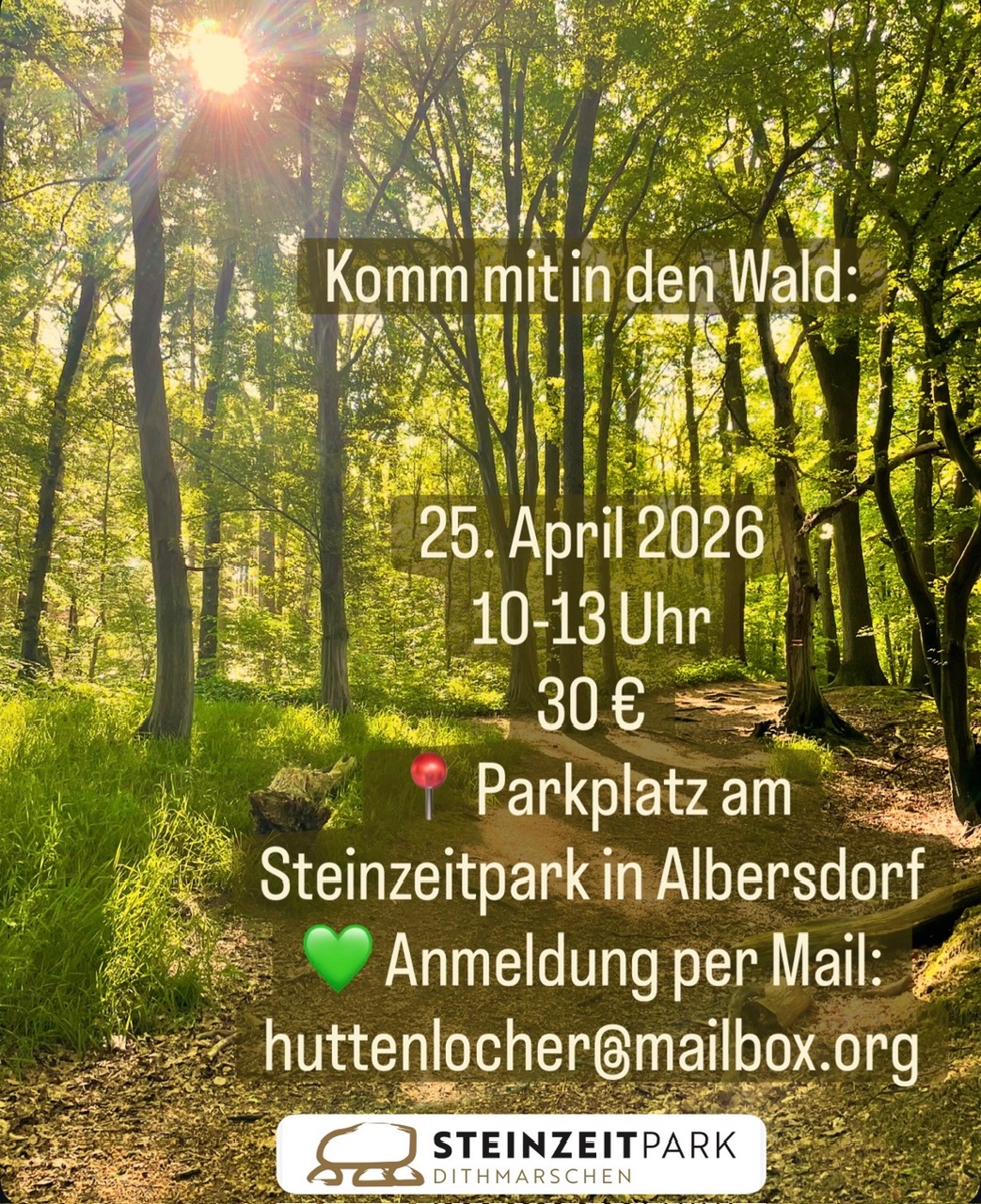 „Waldbaden“ im Steinzeitwald im Albersdorfer Steinzeitpark Am Samstag, den 25. 4. 2026 findet von 10.00 bis 13.00 Uhr ein Kurs zum „Waldbaden“ im Steinzeitwald im